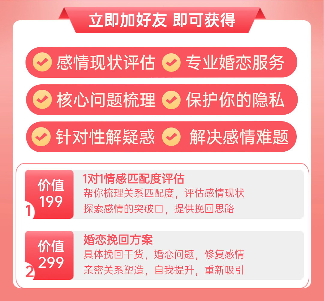 预计3分钟内通过您的好友申请,首次添加的不但可以领取一个大概的挽回方案,还能帮你评估这段感情值不值得挽回,以及挽回成功率并给你一个大致的挽回方向与建议,比你自己摸索的成功率将高出很多,让你少走很多弯路,争取7天内完全扭转对方的态度,努力在30天内挽回对方,避免将对方越推越远!